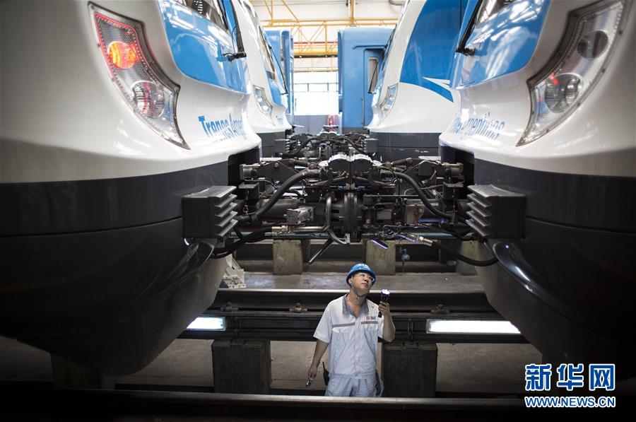 2017年4月11日,在位于阿根廷首都布宜諾斯艾利斯以南的利亞瓦略爾,中方技術(shù)人員檢查為羅卡線城際鐵路提供的列車。近年來,在阿根廷,中車制造的各種軌距、各種制式、各種型號(hào)的鐵路機(jī)車、動(dòng)車組、客車、貨車和地鐵列車密集交付。新華社發(fā)(馬丁·薩巴拉 攝)