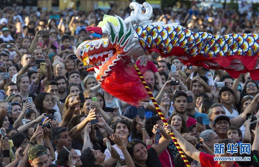 2018年2月10日,在阿根廷布宜諾斯艾利斯舉行的中國春節(jié)廟會(huì)上,觀眾拍攝舞龍。新華社發(fā)(馬丁·薩巴拉 攝)