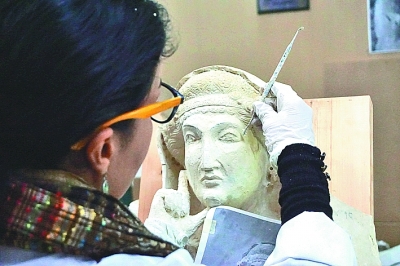 12月5日,在敘利亞首都大馬士革,文物修復師赫芭·朱馬在國家博物館內修復來自巴爾米拉的受損雕像。新華社發