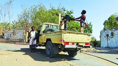11月15日,在也門荷臺達,支持也門政府的武裝人員在一輛軍車上。新華社發