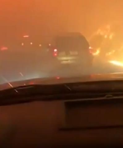 11月8日,美國加利福尼亞州,一位名叫艾倫的父親駕車帶著3歲的女兒撤離比尤特縣天堂鎮。