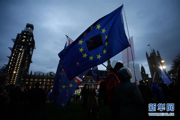 1月15日,在英國倫敦,反對英國“脫歐”示威者在議會大廈外參加集會。新華社發(蒂姆·愛爾蘭攝)