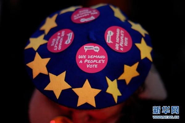 1月15日,在英國倫敦,一名戴著帽子的反對英國“脫歐”示威者在議會大廈外參加集會。 新華社發(蒂姆·愛爾蘭攝)