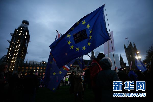 1月15日,在英國倫敦,反對英國“脫歐”示威者在議會大廈外參加集會。新華社發(蒂姆·愛爾蘭攝)