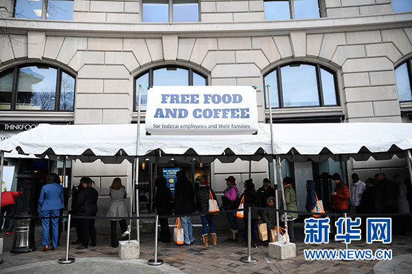 1月23日,在美國首都華盛頓,一些聯邦政府雇員在一家公益組織的“應急食堂”外排隊領取免費餐。 新華社記者 劉杰 攝