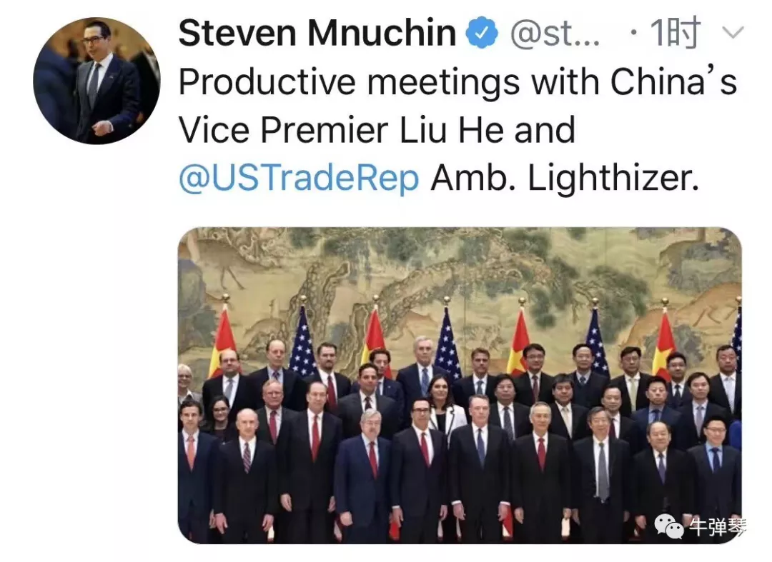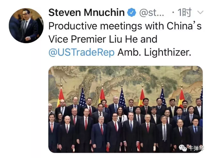 很有意思的,這次磋商一結(jié)束,美國(guó)財(cái)長(zhǎng)姆努欽立刻發(fā)了一條推特,上面寫道:和劉鶴副總理、萊特希澤大使進(jìn)行了富有建設(shè)性的會(huì)議。