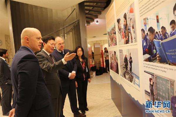 3月4日,在瑞士日內(nèi)瓦聯(lián)合國(guó)萬(wàn)國(guó)宮,來(lái)賓參觀“中國(guó)新疆人權(quán)事業(yè)發(fā)展進(jìn)步”圖片展。新華社記者 施建國(guó) 攝