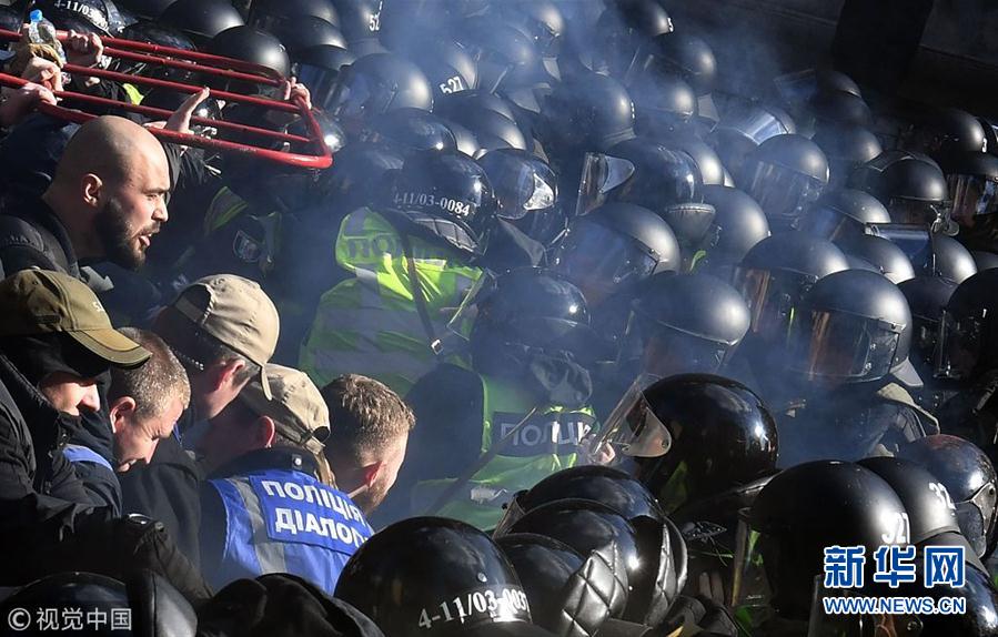 當地時間2019年3月9日,烏克蘭基輔,烏克蘭民族主義政黨的激進分子集會要求調查烏克蘭武裝部隊官員的腐敗問題,與警方發生激烈沖突。(圖片來源:視覺中國)