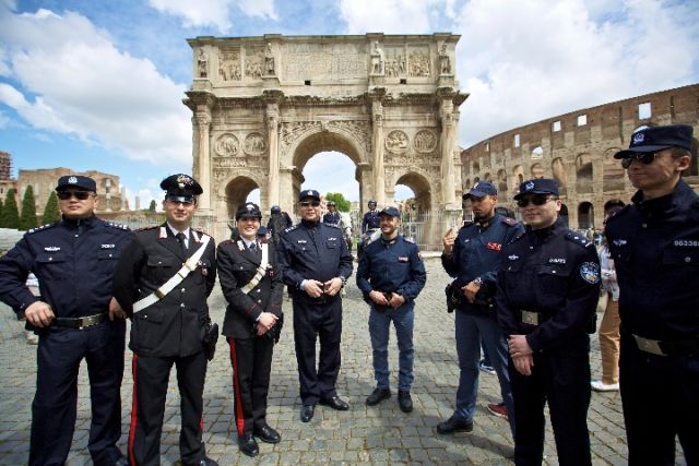 2016年5月2日,中意首次聯合警務巡邏在意大利羅馬啟動。在意大利羅馬君士坦丁凱旋門外,中方警員與意方警員合影。新華社記者金宇攝