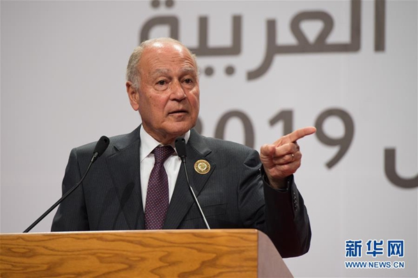 3月31日,在突尼斯首都突尼斯市,阿拉伯國家聯盟秘書長蓋特在記者招待會上講話。新華社記者 孟濤 攝