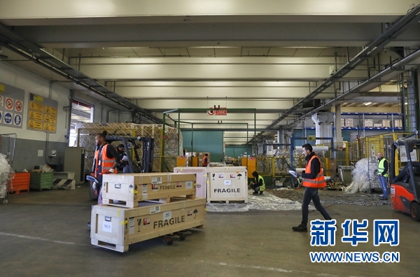 4月8日,在意大利米蘭馬爾彭薩機場,工作人員準備將打包好的中國流失文物藝術品按規格裝到集裝板上,為中國流失文物藝術品上機作準備。? 新華社記者 程婷婷 攝