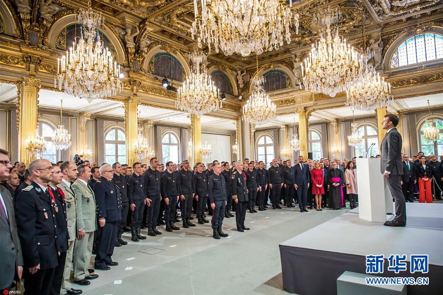 當(dāng)?shù)貢r(shí)間2019年4月18日,法國(guó)巴黎,法國(guó)總統(tǒng)馬克龍?jiān)趷?ài)麗舍宮接見(jiàn)參與巴黎圣母院火災(zāi)救援任務(wù)的消防員。(圖片來(lái)源:東方IC)