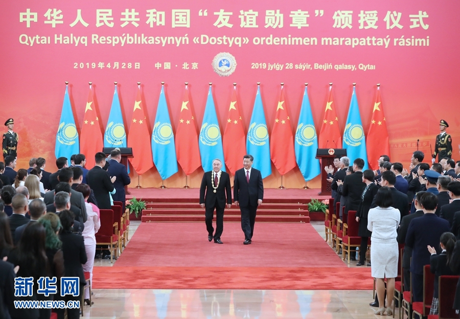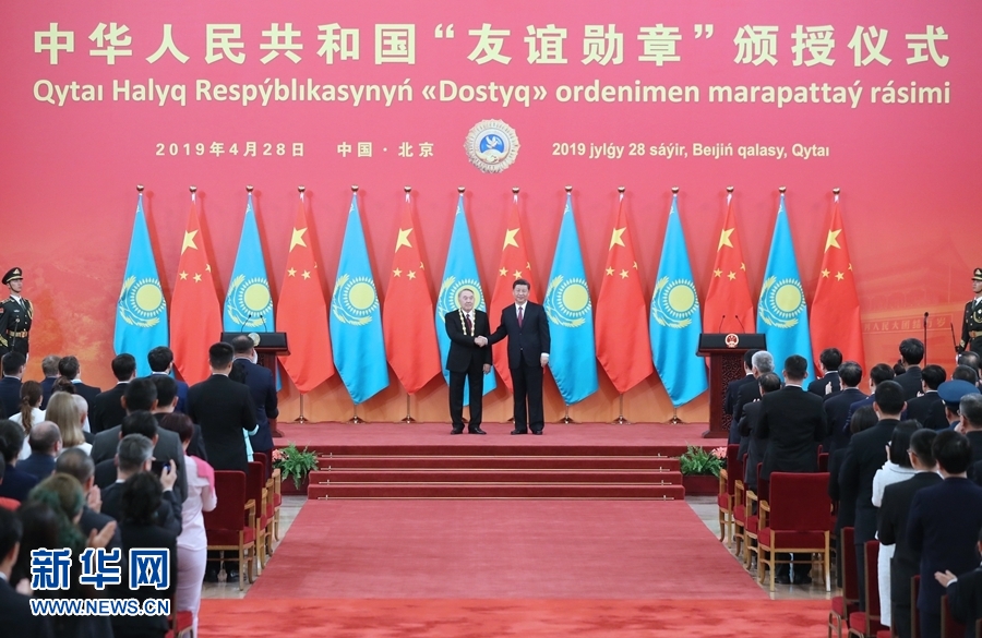 新華社北京4月28日電(記者白潔、馬巖)國家主席習近平28日在人民大會堂中央大廳為哈薩克斯坦首任總統納扎爾巴耶夫舉行“友誼勛章”頒授儀式。