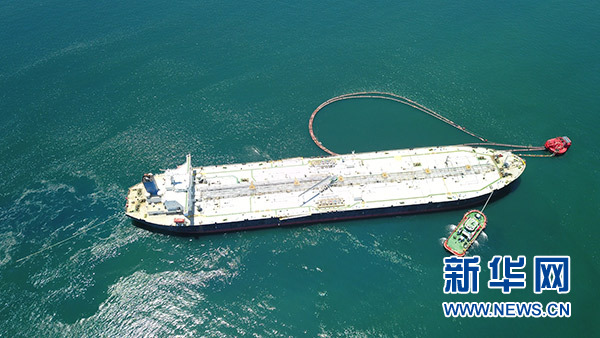 5月3日,一艘油輪在文萊海面上接卸恒逸石化大摩拉島綜合煉化項目所需原油(航拍照片)。 新華社發(恒逸實業供圖)