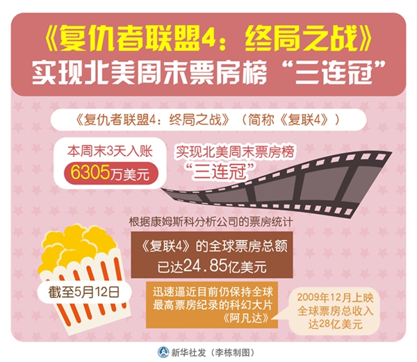 根據(jù)康姆斯科分析公司的票房統(tǒng)計,截至5月12日,《復(fù)聯(lián)4》的全球票房總額已達24.85億美元,迅速逼近目前仍保持全球最高票房紀錄的科幻大片《阿凡達》。2009年12月上映的《阿凡達》由著名導(dǎo)演詹姆斯·卡梅隆執(zhí)導(dǎo),全球票房總收入達28億美元。