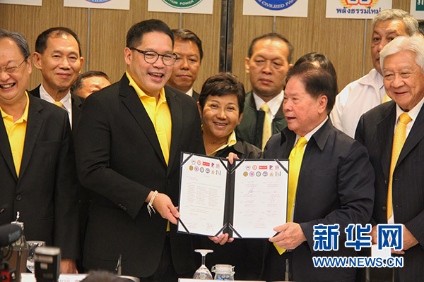 5月13日,在泰國曼谷,泰國力量黨黨首三攀(中右)作為11黨代表向人民國家力量黨黨首烏達(dá)瑪(中左)提交支持意向書。 新華社記者 楊舟 攝