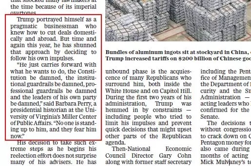 “他把自己描繪成一個務實的商人”,但是“他只是想做什么就做什么,憲法該死、制度該死、專業防護措施該死,”弗吉尼亞大學米勒公共事務中心的總統歷史學家芭芭拉·佩里說:“他所在黨派的領導人都很可惡,”“沒有人站起來對抗他,他們現在害怕他?!?/strong>