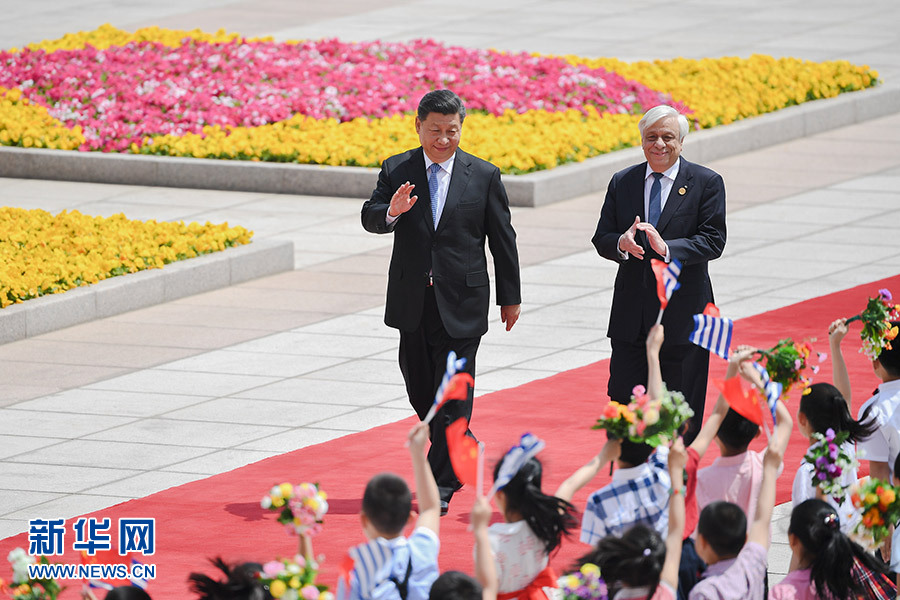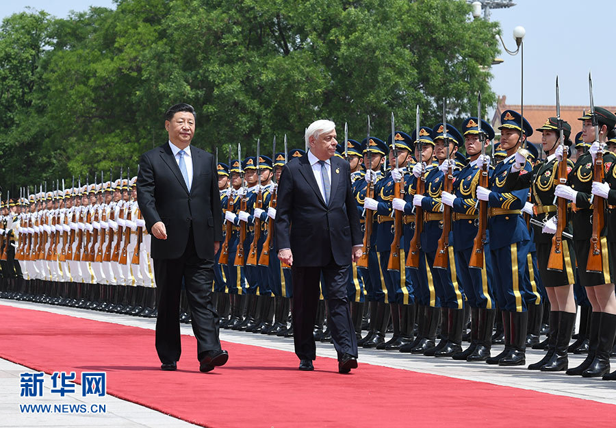 5月14日,國家主席習近平在北京人民大會堂同希臘總統帕夫洛普洛斯舉行會談。這是會談前,習近平在人民大會堂東門外廣場為帕夫洛普洛斯舉行歡迎儀式。 新華社記者 燕雁 攝