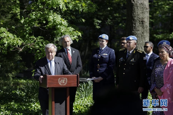 5月24日,在位于紐約的聯(lián)合國總部,聯(lián)合國秘書長(zhǎng)古特雷斯(左一)在儀式上致辭。新華社記者 李木子 攝