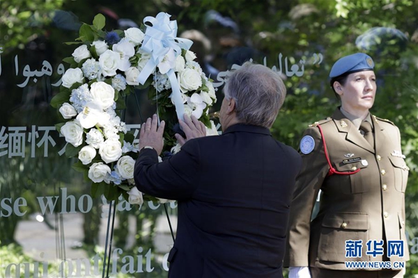悼念活動(dòng)上午9時(shí)開始,聯(lián)合國秘書長(zhǎng)古特雷斯向維和人員紀(jì)念碑敬獻(xiàn)花圈并致辭。