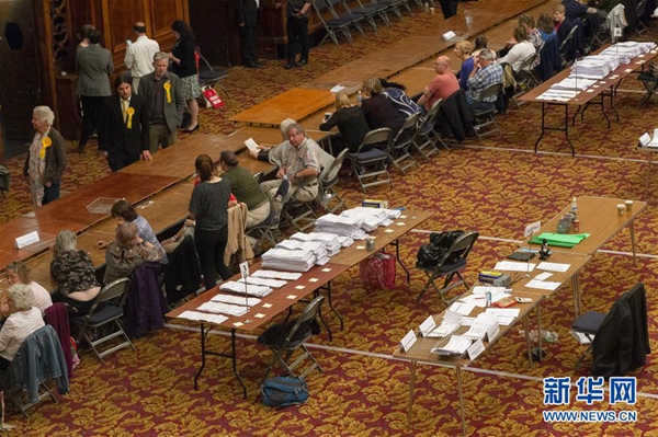 5月26日,在英國南安普敦的一個計票站,工作人員進行計票。新華社發(雷伊·唐 攝)