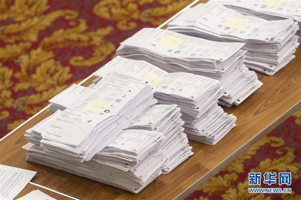 這是5月26日在英國南安普敦的一個計票站拍攝的選票。五年一次的歐洲議會選舉23日至26日在歐盟28個成員國間舉行。選民將選舉出751名議員,組成第九屆歐洲議會,任期5年。新華社發(雷伊·唐 攝)