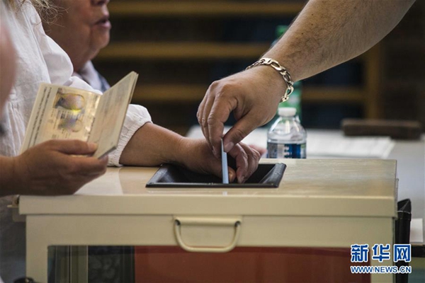 5月26日,在比利時布魯塞爾,選民在一處投票站準備投票。新華社記者 鄭煥松 攝
