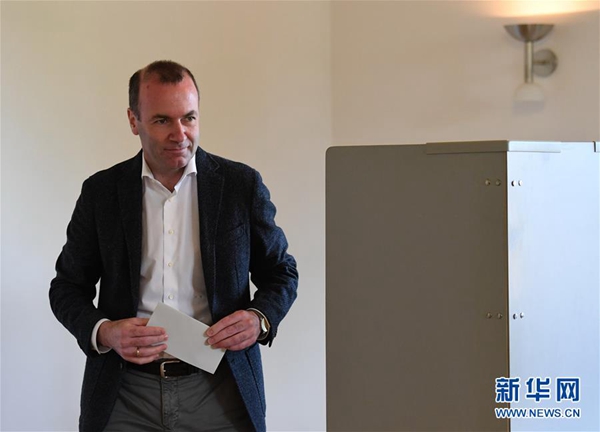 5月26日,在德國維爾登貝格,歐洲人民黨歐盟委員會主席候選人曼弗雷德·韋伯在一處投票站準備投票。新華社記者 逯陽 攝