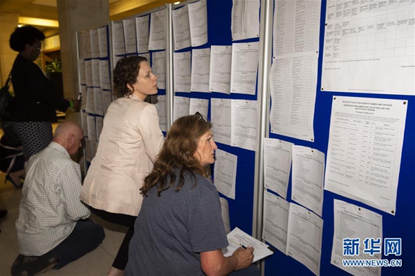 5月26日,在英國南安普敦的一個計票站,媒體和黨派成員查看投票結果。新華社發(雷伊·唐 攝)