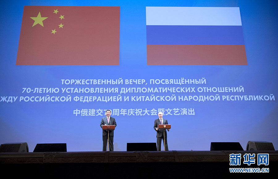 習近平說,今天,我們隆重慶祝中俄建交70周年,共同迎來兩國關系又一個歷史性時刻。我們不會忘記,在艱苦卓絕的衛國戰爭和抗日戰爭期間,中蘇軍民并肩作戰、共同抗擊法西斯侵略,用鮮血鑄就了牢不可破的戰斗情誼。在中華人民共和國成立的第二天,蘇聯即承認并同新中國建立外交關系。在新中國建設百廢待興的歲月里,大批蘇聯專家用智慧和汗水幫助新中國奠定了工業化基礎,也書就了兩國人民友誼的佳話。進入21世紀,雙方簽署具有里程碑意義的《中俄睦鄰友好合作條約》。兩國關系提升為全面戰略協作伙伴關系,為推動建設新型國際關系、構建人類命運共同體樹立了典范。