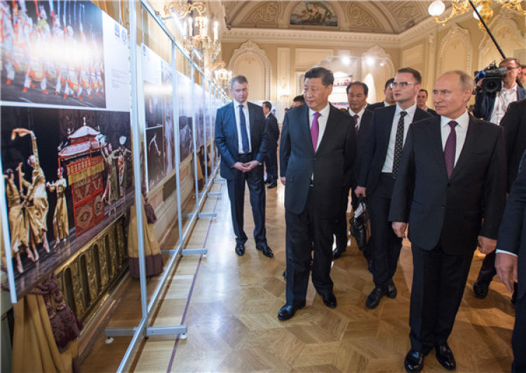 ↑6月5日,國家主席習近平和俄羅斯總統普京在莫斯科大劇院共同出席中俄建交70周年紀念活動。這是兩國元首共同參觀中俄建交70周年圖片展。新華社記者 李學仁 攝