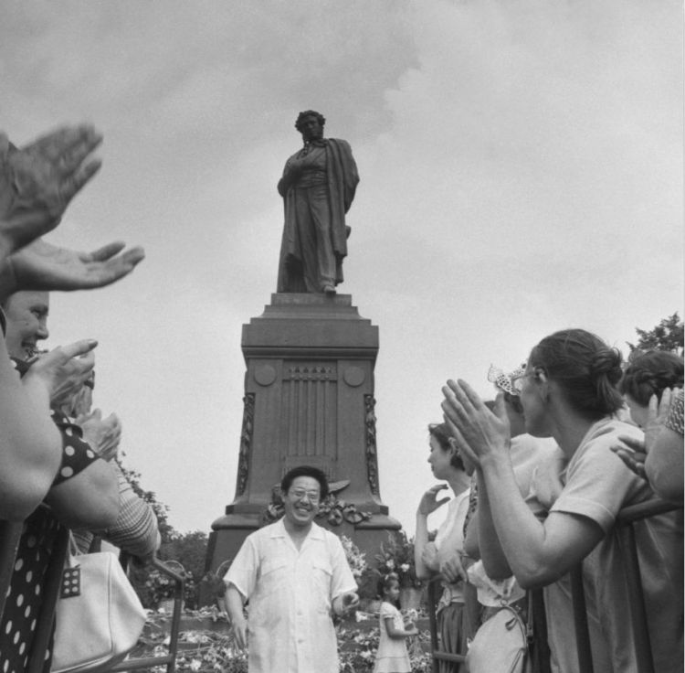 ↑莫斯科群眾歡迎一位中國老師用俄語和中文朗誦普希金的詩歌。 (1986年,伊戈爾·佐京)