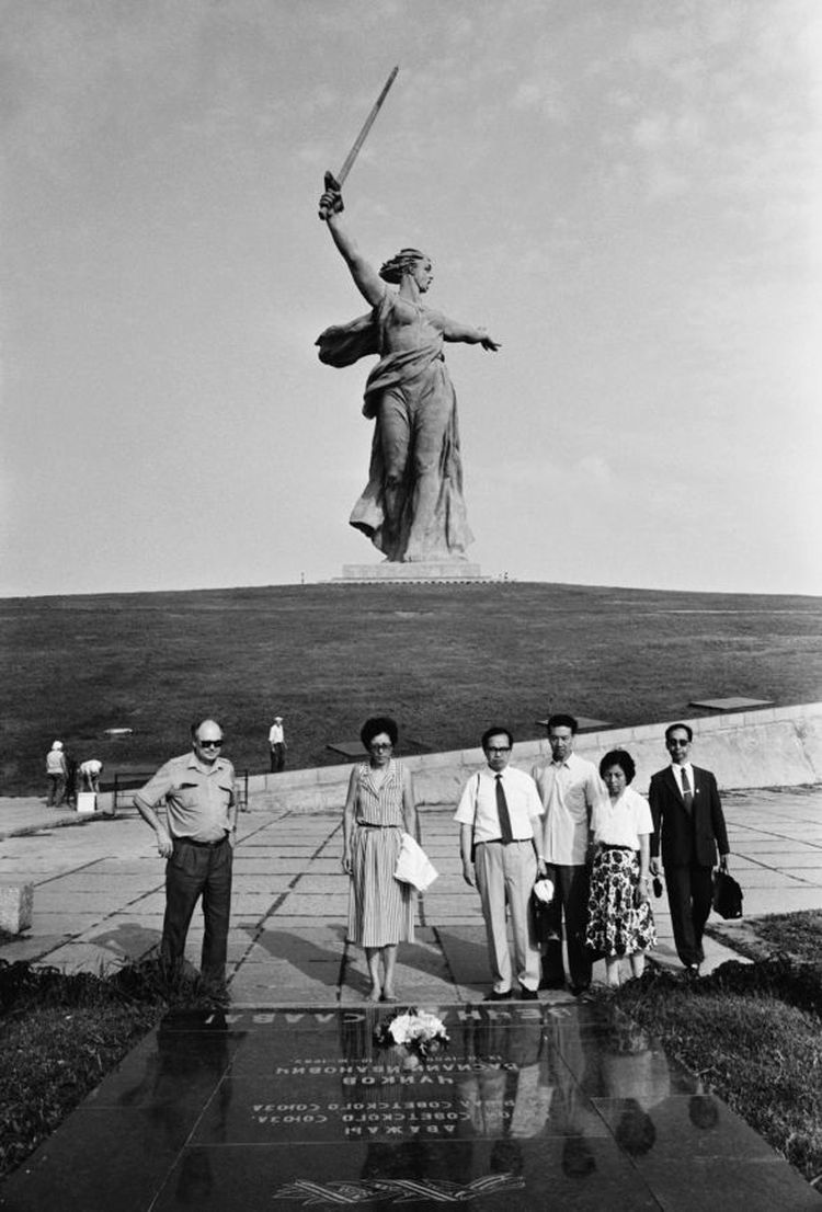 ↑中國記者在伏爾加格勒馬馬耶夫山崗合影。 (1987年,塔斯社稿)