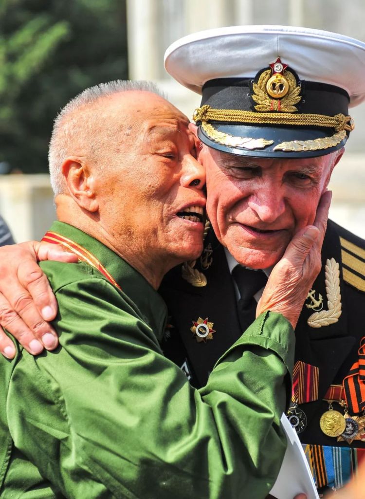 ↑吉林長春,中俄雙方抗戰老戰士在祭奠蘇聯紅軍烈士活動上相擁。(2015年9月2日,許暢)