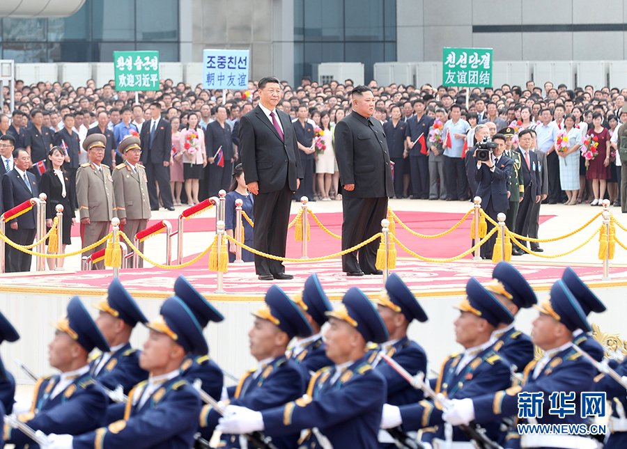 朝方在機場舉行隆重歡迎儀式。在21響禮炮聲中,軍樂隊奏中朝兩國國歌,習近平在金正恩陪同下檢閱了朝鮮人民軍三軍儀仗隊,并觀看了分列式表演。