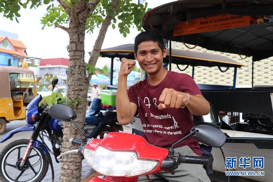 6月11日,在柬埔寨暹粒,孫塞貼農(nóng)騎在嘟嘟車上對(duì)鏡頭做出武術(shù)動(dòng)作。新華社記者 毛鵬飛 攝