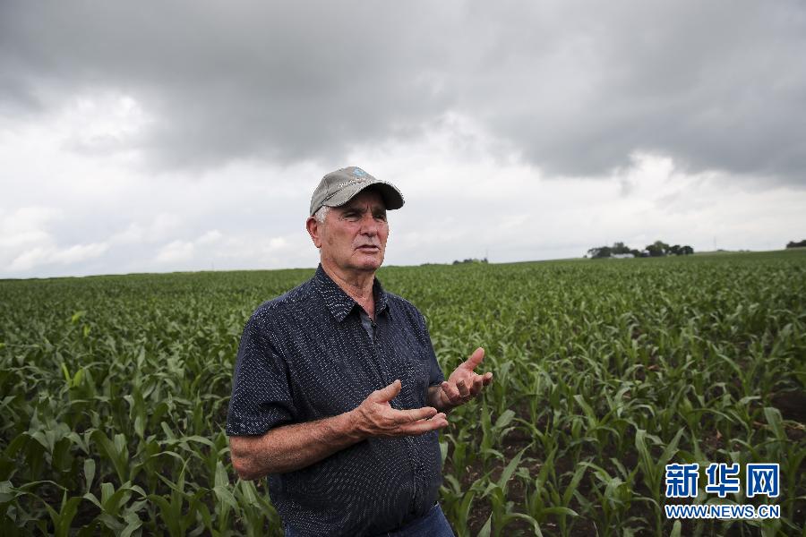 6月18日,在美國艾奧瓦州大西洋鎮(zhèn),農(nóng)場主比爾·佩雷特在自家的玉米地里接受采訪。?新華社記者 王迎 攝