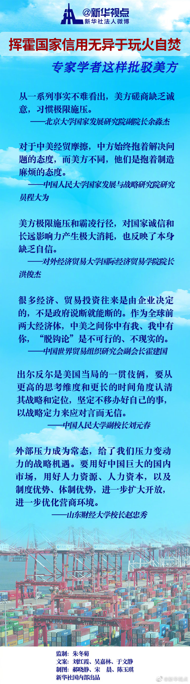 中國人民大學副校長劉元春認為,出爾反爾是美國當局的一貫伎倆,要從更高的思考維度和更長的時間角度認清其戰略和定位,堅定不移辦好自己的事,以戰略定力來應對言而無信。