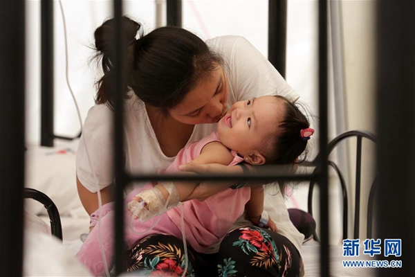 8月13日,在菲律賓甲米地省一處登革熱應急醫療站,一名母親照顧自己患病的孩子。新華社發(魯埃勒·烏馬利 攝)