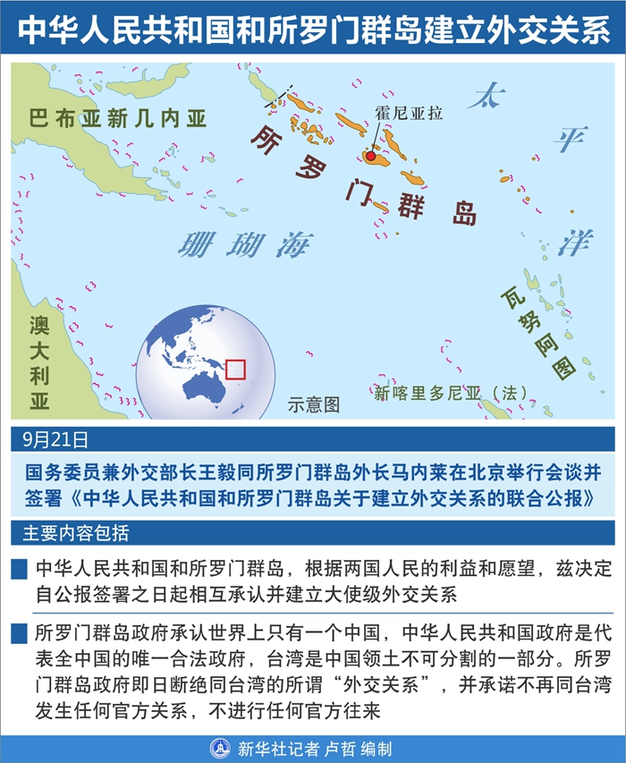 中所建交公報在北京簽署前,所羅門群島政府發(fā)表聲明,宣布承認一個中國原則,同臺灣當局斷絕所謂“外交關系”。