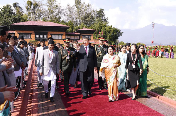 10月12日,國家主席習近平乘專機抵達加德滿都,開始對尼泊爾進行國事訪問。尼泊爾總統班達里在機場為習近平舉行具有濃郁尼泊爾民族特色的歡迎儀式。新華社記者高潔攝