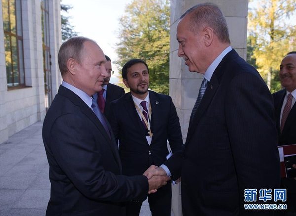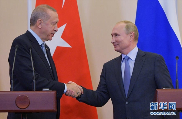 10月22日,在俄羅斯索契,俄羅斯總統普京(左)與到訪的土耳其總統埃爾多安握手。新華社/衛星社