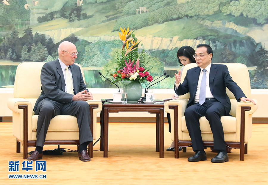 10月23日,國務院總理李克強在北京人民大會堂會見美國前財政部長保爾森。 新華社記者 姚大偉 攝
