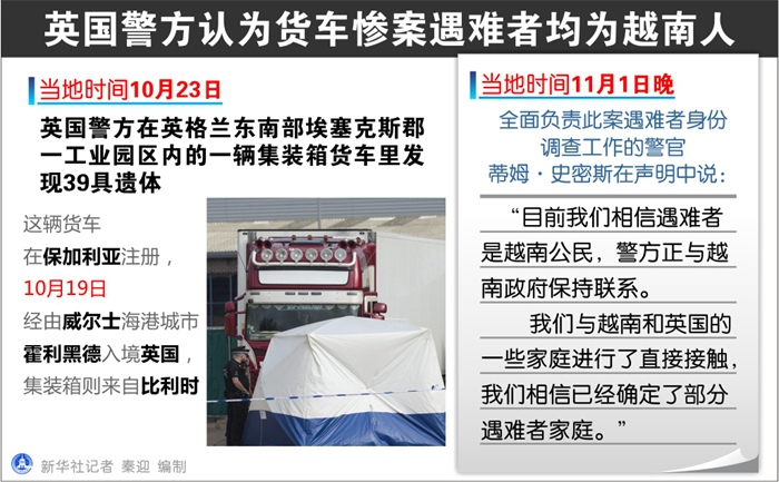 新華社倫敦11月1日電(記者張代蕾)英國埃塞克斯郡警方11月1日晚發表聲明說,警方目前認為上月發生的貨車慘案39名遇難者均為越南人。