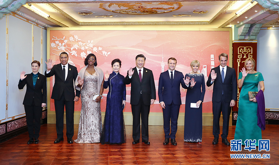 11月4日晚,國家主席習(xí)近平和夫人彭麗媛在上海和平飯店舉行宴會(huì),歡迎出席第二屆中國國際進(jìn)口博覽會(huì)的各國貴賓。這是宴會(huì)前,習(xí)近平和彭麗媛同法國總統(tǒng)馬克龍夫婦、牙買加總理霍爾尼斯夫婦、希臘總理米佐塔基斯夫婦、塞爾維亞總理布爾納比奇等外方貴賓合影留念。 新華社記者 鞠鵬 攝