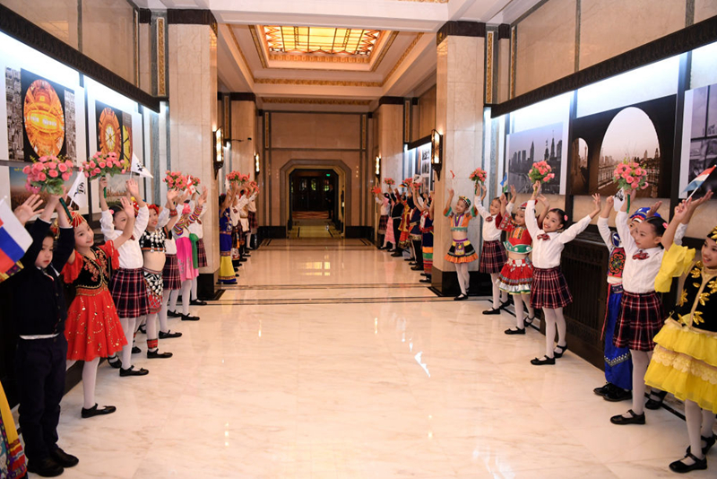 身著各民族服裝的少年兒童載歌載舞,迎接嘉賓到來——