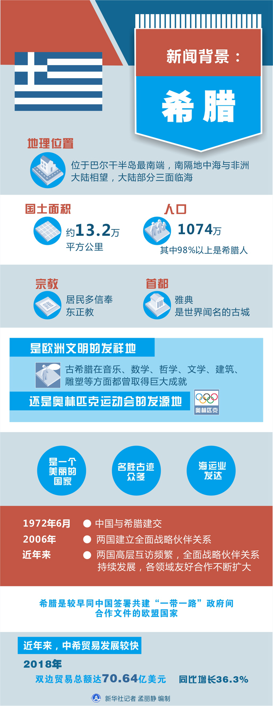 中國與希臘1972年6月建交。2006年,兩國建立全面戰略伙伴關系。近年來,兩國高層互訪頻繁,全面戰略伙伴關系持續發展,各領域友好合作不斷擴大。希臘是較早同中國簽署共建“一帶一路”政府間合作文件的歐盟國家。近年來,中希貿易發展較快。2018年,雙邊貿易總額達70.64億美元,同比增長36.3%。