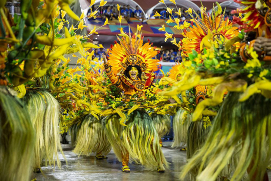 2019年3月4日晚,在巴西里約熱內盧,桑巴舞校演員參加狂歡節游行。新華社記者李明攝
