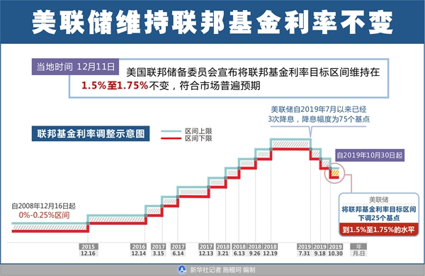 新華社華盛頓12月11日電(記者楊承霖 高攀)美國(guó)聯(lián)邦儲(chǔ)備委員會(huì)11日宣布將聯(lián)邦基金利率目標(biāo)區(qū)間維持在1.5%至1.75%不變,符合市場(chǎng)普遍預(yù)期。