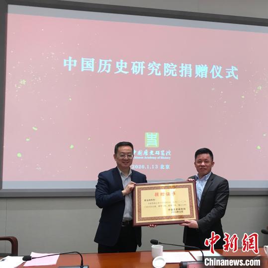中國社科院副院長、黨組成員,中國歷史研究院院長、黨委書記高翔為陳玉樹頒發捐贈證書。 冉文娟 攝